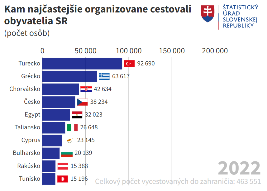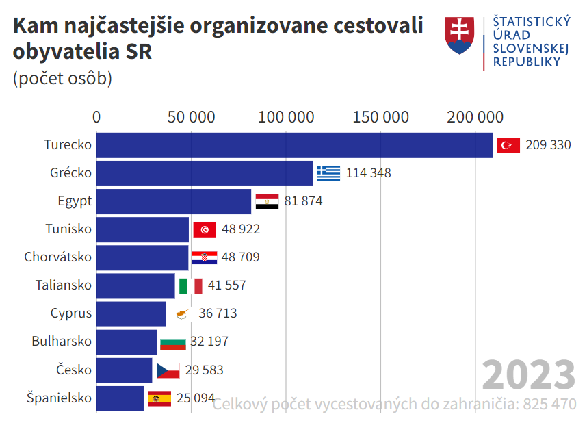 V roku 2023 vycestovalo za hranice Slovenska až 825-tisíc ľudí prostredníctvom slovenských CK. Tento nárast o 78 % oproti roku 2022 je jasným dôkazom, že Slováci opäť radi objavujú svet. Tradičné destinácie ako Turecko, Grécko, Egypt a Tunisko zostávajú v popredí, pričom viac ako polovica klientov sa rozhodla pre tieto krajiny. Čo je však naozaj zaujímavé, je rapídne rastúci záujem o exotické miesta ako Vietnam a Kuba.