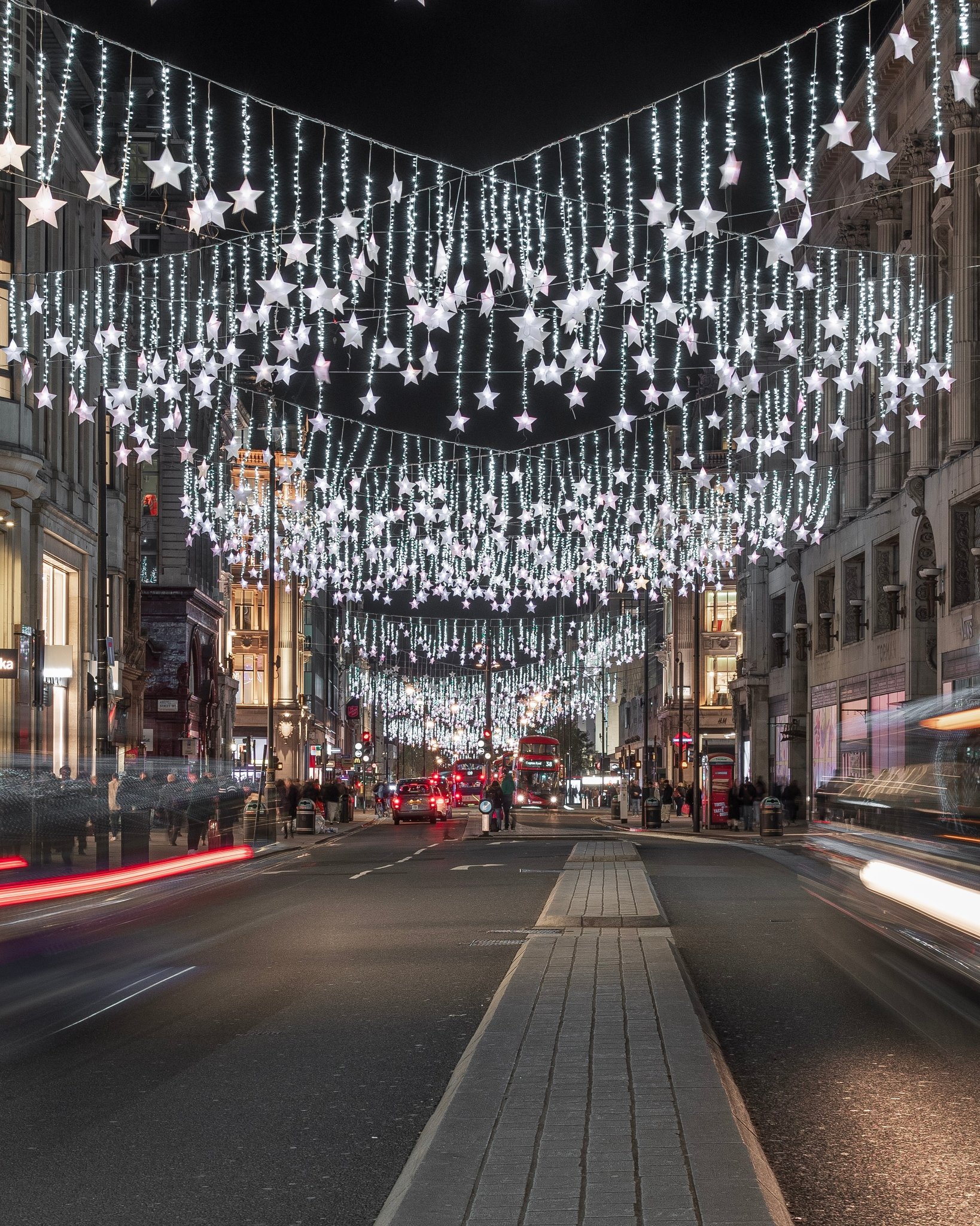 Tohtoročné vianočné osvetlenie na Oxford Street predstavuje návrat visiacich hviezd, ktoré vylepšujú oblohu nad slávnou ulicou. Rušná nákupná tepna prináša svetlá z recyklovaného plastu vrátane 300 000 LED žiaroviek. Najznámejšia nákupná ulica sa zmenila na fotogenickú krajinu zázrakov. Hviezdy majú charitatívny charakter a pomáhajú deťom v nemocnici zažiť krajšie chvíle počas ich liečby.
