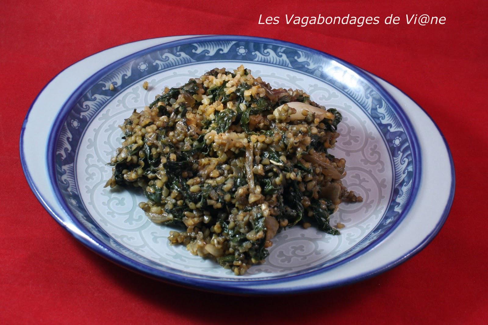 Bulgur uvaríme do mäkka a necháme vychladnúť. Očistenú a nadrobno nakrájanú cibuľu podusíme na horúcom olivovom oleji. Ošúpaný cesnak nastrúhame, pridáme očistené špenátové listy a krátko podusíme. Pridáme k vychladnutému bulguru, premiešame s trochou (alebo veľa) na kolieska nakrájanou jarnou cibuľkou a nakoniec dochutíme čerstvo vytlačenou citrónovou šťavou. Dobre premiešame a podávame posypané semiačkovou zmesou.