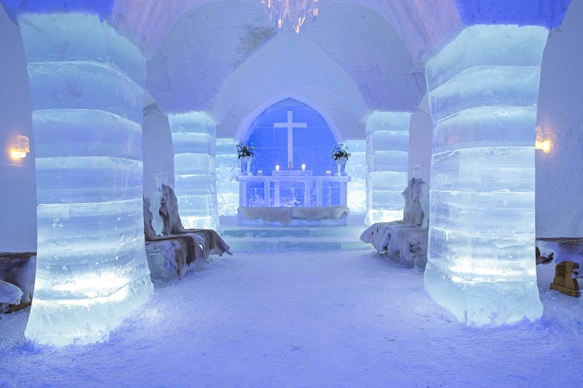 Ahogy a képen is látszik, az aprócska kápolna az egyik legszebb része az óriási iglunak, nem véletlen, hogy sokan lecsapnak rá különleges esküvői helyszín után kutatva. A jéghotelek sorában ez a legészakibb a világon, és egyébként egy nagyobb üdülőkomplexum része. Összesen (és folyamatosan) 250 tonna jégre van szükség ahhoz, hogy a szálloda szép, tiszta és friss maradjon. Az ágyakat rénszarvasprémmel terítik be, amelyek egészen -30 celsius fokos külső hőmérsékletig komfortossá teszik az ülő- és fekvőhelyeket. A jégkunyhók mellett felépített szaunákban felmelegedhetünk, ha túl sok lenne a jégből, a jéghotel mellett üzemelő lodge pedig az egész szezonban változatos programokkal vár. A 20 szobával rendelkező Sorrisniva Igloo Hotelben vannak egyébként családi szobák és lakosztályok is, így akár a teljes család hidegtűrését letesztelhetjük.