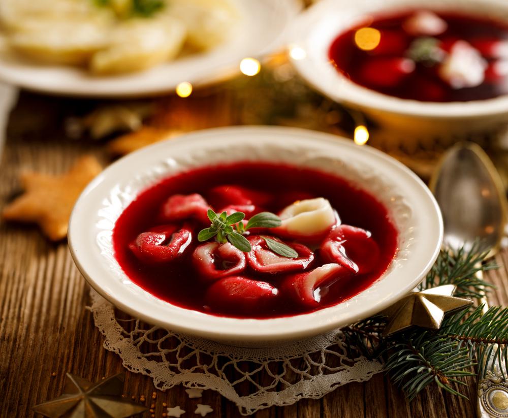 A leves elkészítését egy nappal előbb kell elkezdeni. A céklát és az almát lereszeljük, vízzel felöntjük, babért, citromlevet, cukrot, sót, borsot és szegfűborsot adunk hozzá és megfőzzük. Ha megfőtt, gézlapon keresztül egy éjszakán át hagyjuk lecsepegni. Másnap átpasszírozzuk, és adunk hozzá ecetet, ízlés szerint még sót, cukrot és borsot. Tálalás előtt felmelegítjük, de forralni nem szabad, mert elveszti szép piros színét. Gombával töltött mini piroggal tálaljuk.