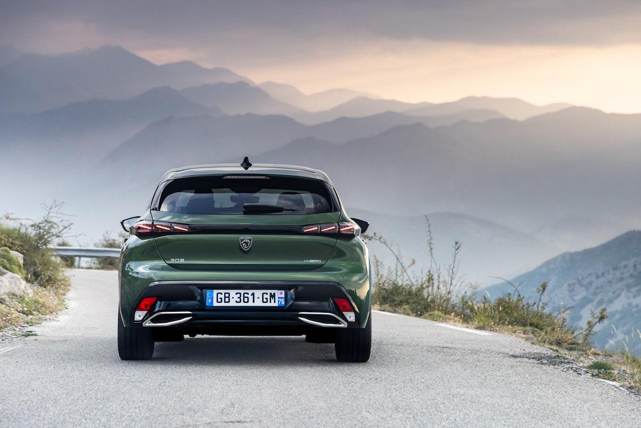 A terjedelmes hűtőmaszk tekintélyt parancsol, króm csíkozása az új Peugeot emblémára irányítja a figyelmet – igen, ez az első olyan Peugeot-modell, amely már a 2021-ben bemutatott, pajzsra emelt oroszlánt viseli. Látványosak a nappali menetfény hosszú fénycsíkjai is, amelyek messziről felsimerhetővé teszik az új 308-ast. A fő lámpatest alapáron LED-es, a magasabb felszereltségeknél mátrixos, ez a technológia a körülményeknek megfelelően folyamatosan alakítja a 40 LED által vetített intenzív fénycsóvát. Az autó sziluettje sportos, elődjéhez képest pedig nagyot nőtt: 11 centivel lett hosszabb, viszont két centivel alacsonyabb, így nem csoda hogy dinamikusnak hat.