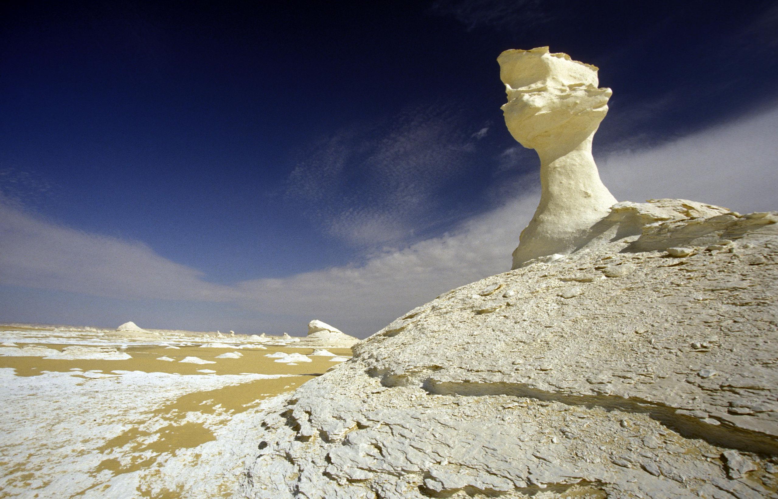 Ez a sokkolóan fehér táj és a hófehér gombaalakzatok olyanok, mintha krétából faragták volna ki őket. Az egyiptomi nemzeti parkot 2002-ben alapították, azóta is kedvelt kirándulóhely: a park legmagasabb pontja az El Qess Abu Saidnál található (353 m tengerszint feletti magasságban), a legalacsonyabb pontja pedig a Wadi Hennisnél (32 m).