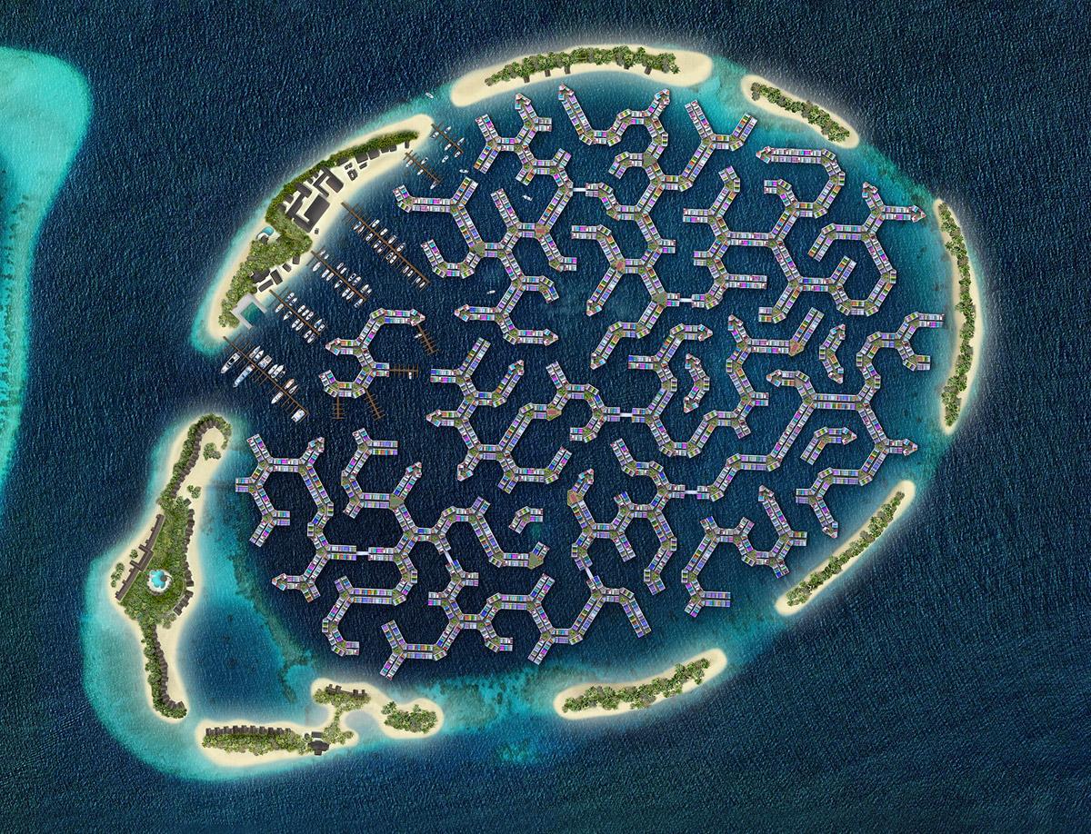 A tengervíz szintjének növekedése súlyosan veszélyezteti az 1190 szigetből álló Maldív-szigetek jövőjét. A kormány megbízásából egy holland építésziroda egy 20 ezer főt befogadó, vízen lebegő várost tervezett tízperces hajóútra a jelenlegi fővárostól. A lebegő város mintaprojekt 2027-re készül el, és biztonságos, megfizethető alternatívát ígér a lakhatásra.