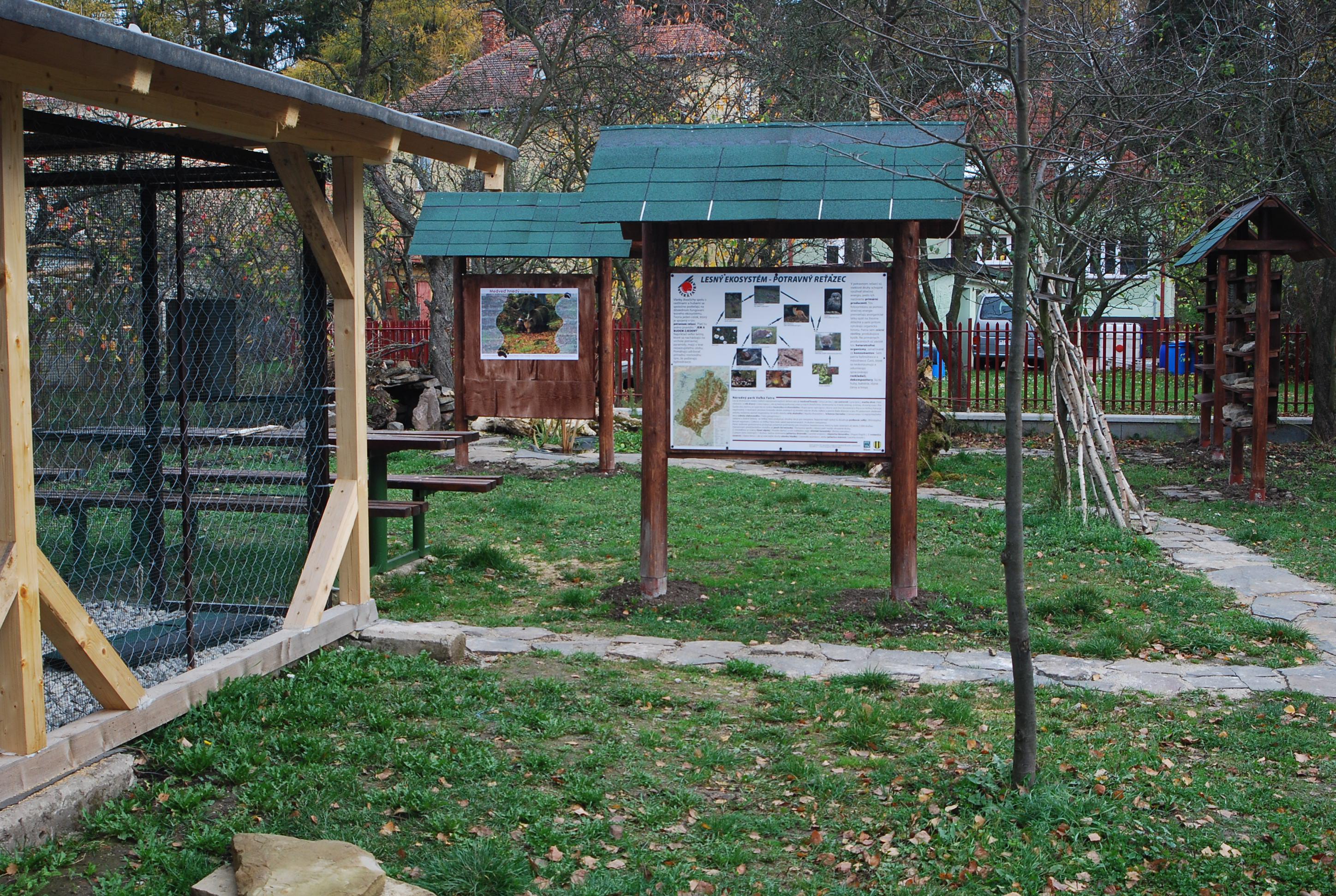 Záhrada ponúka ukážky vodnej plochy, mokrade, spoločenstvá rôznych typov suchozemských rastlín a drevín (lúčne, skalné, lesné a pod.) kútik neživej prírody (nerasty, horniny, skameneliny). Kútik pobytových znakov vtákov (zbierka opustených rôznych typov hniezd: z bylín, blata, konárov, bútľavé kmene stromov, vtáčie búdky, perie vtákov, vypchaté uhynuté jedince, fotogaléria), kútik pobytových znakov cicavcov (ležoviská, sádrové odliatky stôp, vzorky srstí a trusu a podobne)