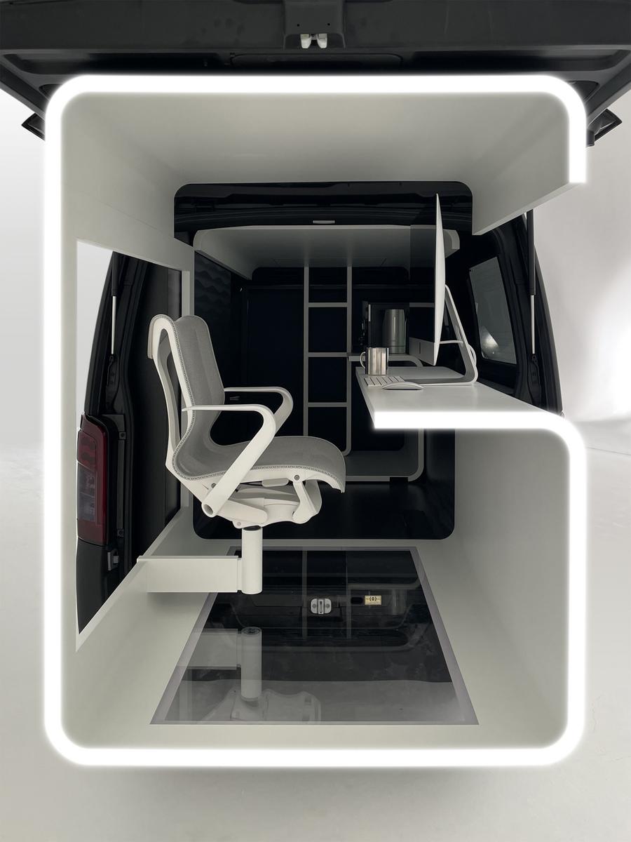 Koncept výrazne uľahčuje spojenie cestovania a kancelárskej práce, vo všetkom sa prispôsobil potrebám digitálnych nomádov. Robustne pôsobiaci vonkajší dizajn naznačuje, že dodávka nájde uplatnenie nielen v meste na asfalte, ale nestratí sa ani v ľahšom teréne. V interiéri sa nachádza maličká, ale plne funkčná kancelária so stoličkou, s písacím stolom, veľkoplošným monitorom a kávomatom. Kancelársky modul sa dá vytiahnuť, takže môžete pracovať pod holým nebom na čistinke v lese či na pláži, pričom nie je problém dodržať predpísanú vzdialenosť od iných ľudí.