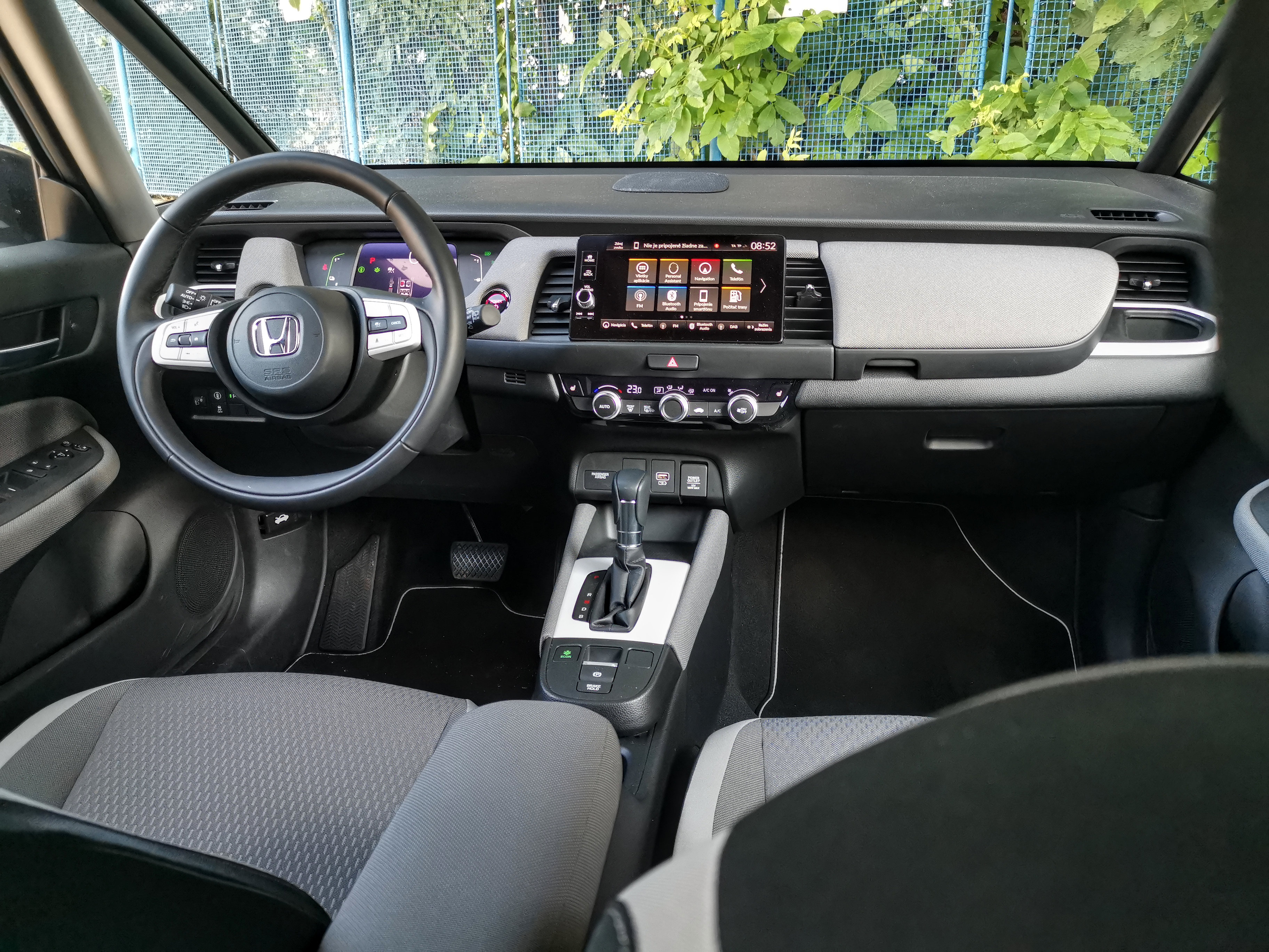 Interiér pôsobí jednoducho. A retro, ak sa to dá vzhľadom na displeje, nahrádzajúce klasické budíky, povedať. Kvalita vypracovania a použité materiály sú na veľmi vysokej úrovni. Prvým prekvapením po nasadnutí do auta sú predné sedadlá. Na mestské auto majú slušné bočné vedenie a poskytnú komfort aj na dlhšiu trasu. Volant je príjemný a displej za ním napriek skromnej veľkosti prehľadný. Hlavný displej navigácie má uhlopriečku sedem palcov a nové grafické rozhranie. Zďaleka nepatrí medzi najkrajšie alebo najnápaditejšie, ale má príjemnú grafiku a vkusne zladené farby a odtiene. Ladí so špičkovo vypracovaným interiérom a nedehonestuje ho. Nový Jazz nemá prevodovku (o tom neskôr), ale klasickú radiacu páku, na akú sme zvyknutí pri automatoch. Jediná výčitka smeruje k usporiadaniu jazdných režimov. Pri radení pákou do zadnej polohy ľahko zvolíte poslednú polohu B namiesto chceného D-éčka, ktoré sa nachádza na predposlednej polohe. Režim B využíva väčšiu mieru rekuperácie a de facto brzdenia po uvoľnení plynového pedála. Skôr ako zaradíme D-éčko a vyrazíme s Jazzom na cesty, aby sme zistili, ako funguje jeho pohonný systém, oplatí sa rozhliadnuť. Zásluhou vajíčkovitej karosérie má šofér Jazzu výborný výhľad. Vďaka rozdelenému A-stĺpiku je síce trochu netradičný, ale veľmi funkčný!