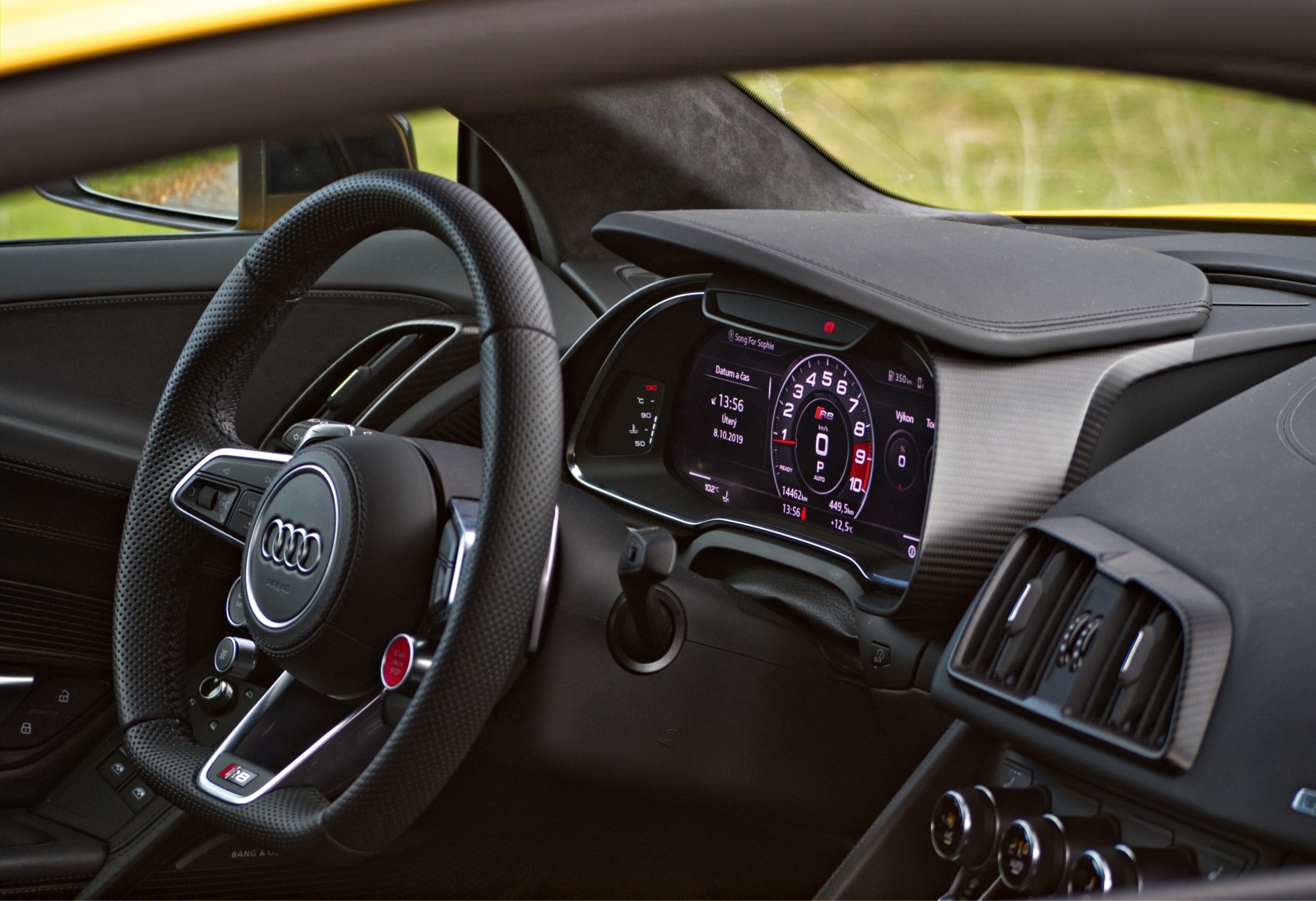 Pri nastupovaní do kokpitu, výrazne ovplyvneného motoristickým športom, nám mysľou preletí spomienka na vtipné virálne video, v ktorom sa z podobného auta snaží vystúpiť objemný pán v rokoch. Trvá mu to takmer minútu. Pre Audi typické kombinácie tmavých materiálov pôsobia príťažlivo a harmonicky. Všetko je na dotyk výnimočné, pričom výnimočný dojem nekazia žiadne mamutie displeje. Na prístrojovej doske pred vodičom je iba jeden, čo R8-čke pridáva na športovej serióznosti. Pozronosť vodiča sa plne koncentruje na volant a najmä na dianie pred ním. na dianie pred ním.
